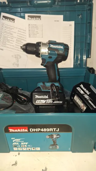 Taladro percutor inalámbrico Makita DHP489RTJ en color azul y negro. Incluye dos baterías de 5.0Ah y cargador. - Modelo: DHP489RTJ - Voltaje: 18V - Par máximo: 80Nm - Incluye maletín de transporte.