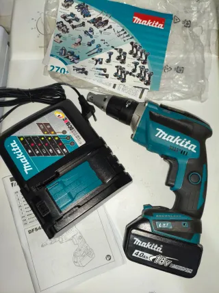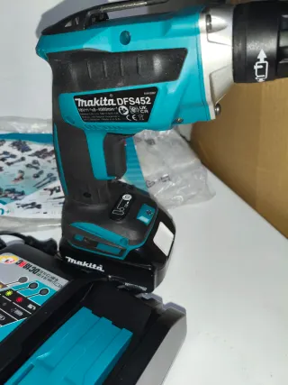 Atornillador de pladur Makita DFS452 en color azul y negro. - Modelo: DFS452 - Voltaje: 18V - Tecnología: LXT, Brushless - Batería: 4.0Ah Lithium-ion y cargador