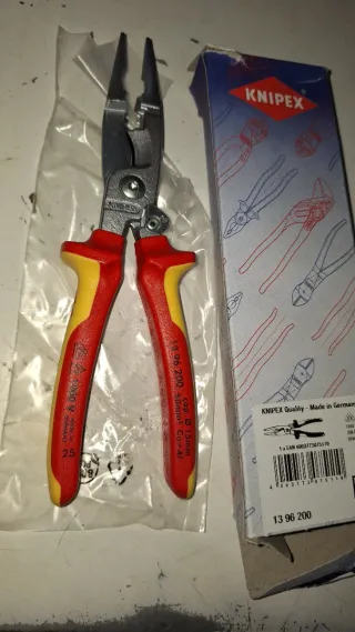 Alicates de electricista Knipex, modelo 13 96 200. - Fabricados en Alemania. - Mango bimaterial rojo y amarillo. - Aislamiento de 1000 V. - Longitud de 200 mm.