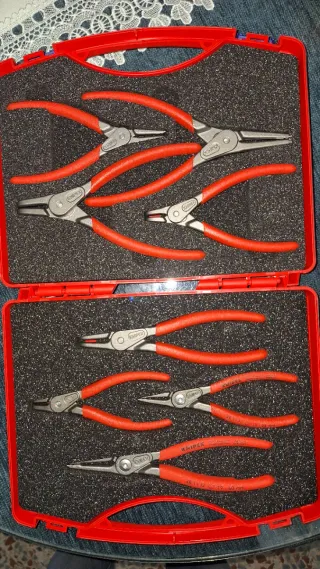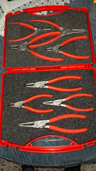 Set de 8 alicates para arandelas de la marca Knipex. - Modelo 002125. - Incluye alicates para arandelas interiores y exteriores. - Mangos de color rojo.