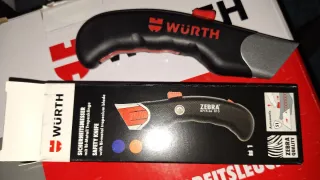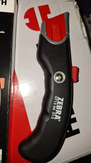 Cutter de la marca Zebra, modelo Wurth, en perfecto estado. - Mango ergonómico de color negro. - Detalle de la marca Zebra y número de modelo 0715 66 013. - Mecanismo de avance y retroceso de la cuchilla en color rojo.
