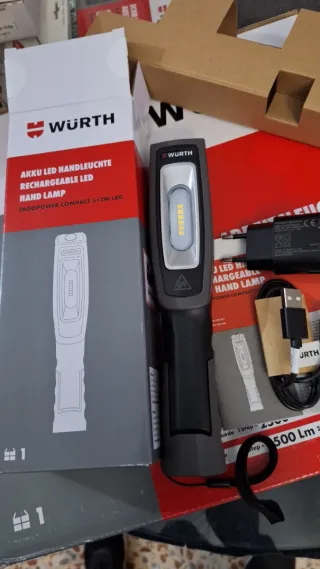 Lámpara de mano LED recargable Wurth Ergopower Compact. - Modelo: Ergopower Compact 5+2W LED. - Incluye cargador y cable USB. - Potencia lumínica de 500 Lm.