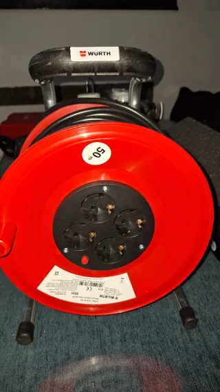 Enrollacables de la marca Wurth con 50 metros de longitud y sección de 3x1,5mm. - Cuatro bases de enchufe. - Color rojo.