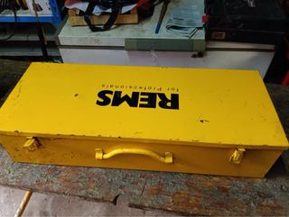 Máquina roscadora eléctrica Rems juego de cabezales. - Incluye varios cabezales de diferentes tamaños: 3/8,1/2,3/4,1",1/14,1/12,2". - Maletín metálico amarillo para transporte y almacenamiento.