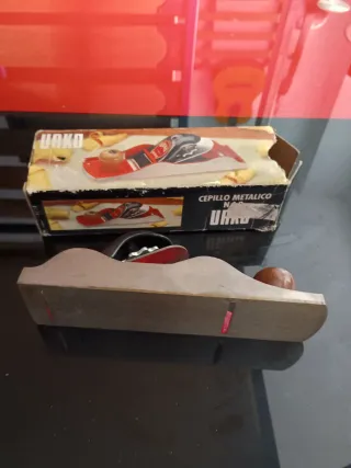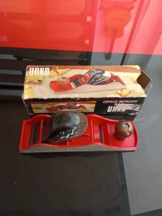 Cepillo metálico de carpintero de la marca URKO. - Cuerpo de metal rojo. - Mango de madera. - Incluye caja original.