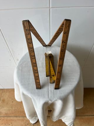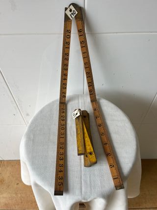 Conjunto de herramientas de medición antiguas. - Metro Rabone No. 1167. MADE IN ENGLAND. Mide en yardas y tiene 35 yardas. - 1 Yarda = 36 pulgadas. - Regla plegable de madera de carpintero.