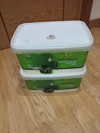 Dos cubos de pintura plástica monocapa Happy Decor en color crema 3 litoros cada cubo = 10 litros. -Sin desprecintar. -Rejilla incluida en cada cubo. -Excelente poder cubriente y lavabilidad. - Acabado mate. - No salpica. -precio por los dos cubos. -Se entrega en mano en Gijón y Oviedo. -Envio por impost.