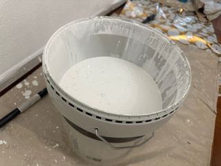 Se abrio el 20-01-26 Restos de pintura blanca para paredes, aproximadamente 7 u 8 litros mas de la mitad del caldero - Color: Blanco. - Cantidad: entren 7 y 8 litros aprox. Esta mas de la mitad del caldero Color blanco mate