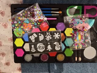 Set de pintura facial y corporal con temática navideña. Incluye todo lo necesario para crear diseños festivos. - Variedad de colores vibrantes. - Pinceles de diferentes tamaños. - Stencils con motivos navideños (calcetín, gorro de Papá Noel, campanas, copo de nieve, árbol de Navidad, muñeco de nieve). - Adhesivos de pedrería para decorar. - Purpurina en varios tonos (plateada, roja, dorada). - Dos aplicadores.
