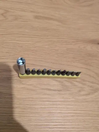 Set de accesorios para taladro y destornillador. - Incluye una variedad de puntas. - Torx, Allen, Phillips y Plano - Viene con un adaptador. - Presentado en un soporte amarillo de silicona dura