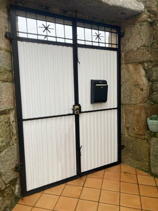 Puerta de chapa y hierro. Medidas: - 174cm ancho - 236cm alto - Diseño con paneles acanalados. - Marco y rejas de metal negro. - Incorpora un buzón negro.