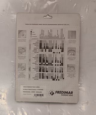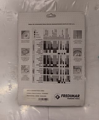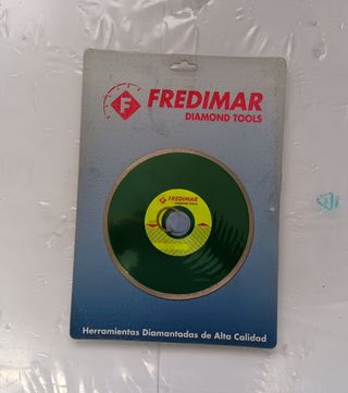 Disco diamante de la marca FREDIMAR, mide de diámetro exterior 180 mm y de diámetro interior 30 mm y con arandela de reducción 25 mm. tel 680 817 072