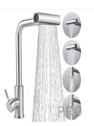 Grifo abatible con 4 modos automáticos de agua, caño giratorio 360° y manguera extensible hasta 50 cm. Funcionalidad y estilo en tu cocina. Medidas: 40x20x3cm