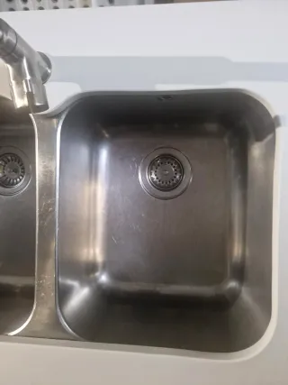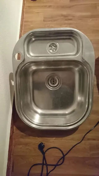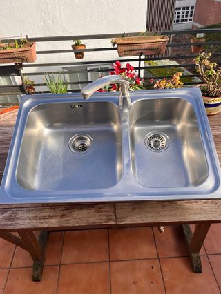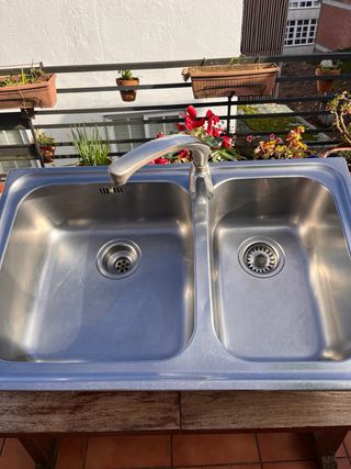 Un fregadero de dos senos de acero inoxidable, con grifo y conexión. 30 EUR Otro fregadero de un seno, con grifo Roca y escurridor. 20 EUR. Buen uso. Por reforma.