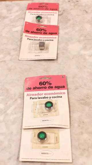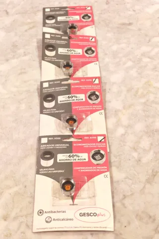 Lote de 8 aireadores universales GESCOplus para grifos de lavabo, fregadero, ducha y bañera. Ayudan a reducir el consumo de agua hasta un 60%. Nuevos, sin usar y en su embalaje original. Incluye: • 4 economizadores para ducha y bañera • 2 aireadores para lavabo y cocina rosca macho M24-100 • 2 aireadores para lavabo y cocina rosca hembra H22-100 18 € el lote completo 2,50 € unidad Compatibles con la mayoría de grifos estándar.
