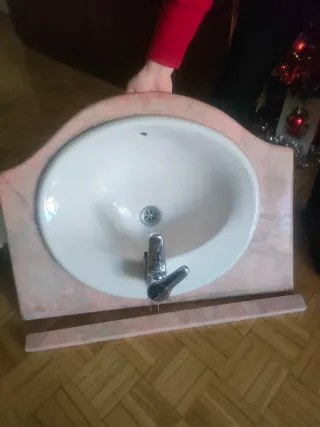 Lavabo de cerámica con grifo marca roca y encimera de mármol rosa. - Diseño ovalado. - Encimera con veteado rosa. - Grifo cromado.