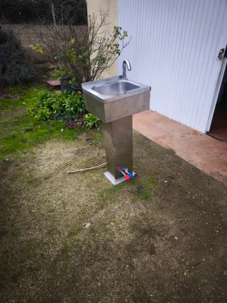Lavabo de pie con grifo y pedal. - Fabricado en acero inoxidable. - Diseño moderno y funcional. - Ideal para negocios o talleres.