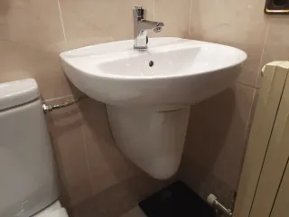 Lavabo de porcelana de la marca Roca, ideal para baños. Incluye grifería. Lavamanos marca valadares, wc marca roca con deposito para colgar (con cadena. Grifo mas soporte de ducha Mueble espejo almacenaje baño. Pregunta si quieres solo alguna pieza
