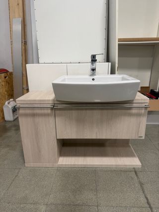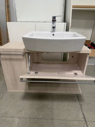 Conjunto de lavabo pequeño con grifo y armario flotante. - Medidas del lavabo: 42 x 26 cm. - Diseño moderno y funcional. - Como nuevo, sin apenas uso - Ideal para niños como lavabo auxiliar - Incorporado grifo y mueble Precio 30€: Armario, lavabo y grifo. Por 5€ más, incorporo espejo grande, para baño o vestidor. Medidas espejo: 1'30*45cm
