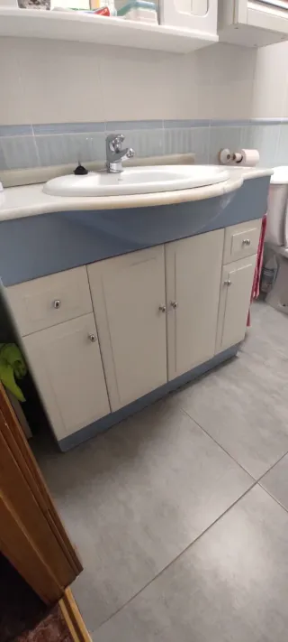 PRECIO NEGOCIABLE. Conjunto de lavabo con mueble y grifo. 35 de fondo. 50 de ancho. 80 de alto. - Mueble blanco con puertas de cristal y tiradores. - Diseño con azulejos azules en las puertas. - Cajón inferior. - Grifo cromado.