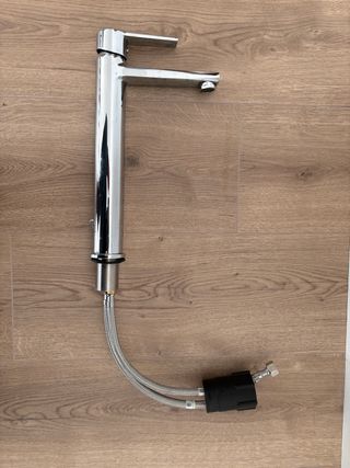 Grifo de lavabo con acabado cromado brillante. Incluye latiguillos de conexión.Nunca usado se cambiaron por otros. - Diseño moderno. - Material: Metal cromado. - Incluye cadena para tapón.
