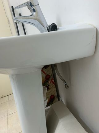 En perfecto estado lavado roca de loza. Conjunto de pie y lavabo usado para grifo monomando. Altura del pie 86.5 cm. Urge, negociable.