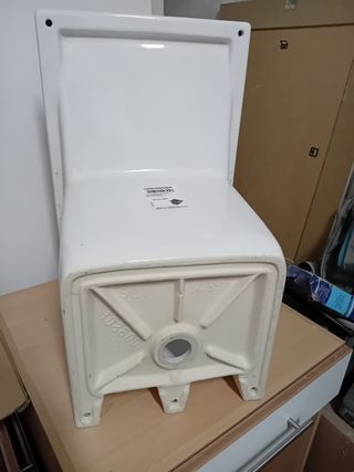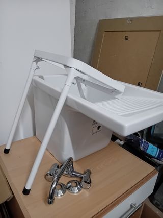 Pila de lavadero, en porcelana, con patas para instalación y grifo de pared. Lo he retirado sin uso, el piso es nuevo y no quería mantenerla instalada.