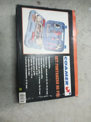 Set de fontanero COAMER de 80 piezas. - 2 alicates de cintrado (8-10-12-14-16 mm). - 1 corta tubos. - 1 alicate desmonta sifón. - 1 fresador de grifo con 6 fresas (10-16 mm). - 1 desatascador de 3 m. - 58 juntas para grifo. - 1 cinta de 12,5 x 10 m. - 7 cabezales de tubo. - 2 piezas de acampanar (5-16 mm).