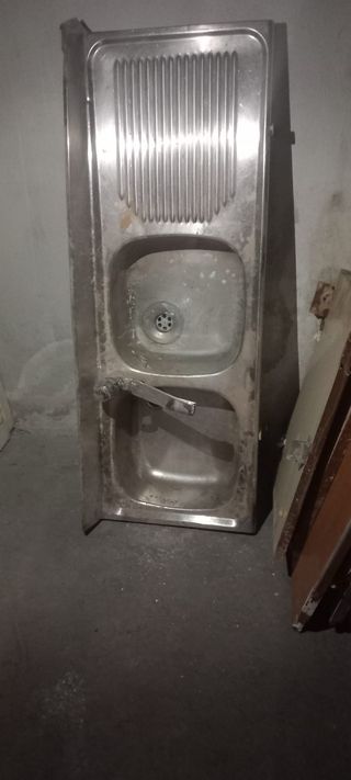 Se vende fregadero de acero inoxidable con dos cubetas y escurridor. REGALO grifo. Medidas 122x42cm aprox - Material: Acero inoxidable. - Doble cubeta. - Escurridor. - Grifo de regalo.