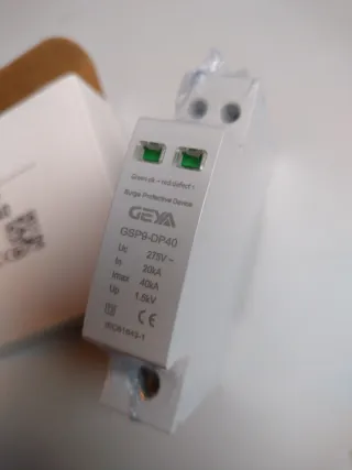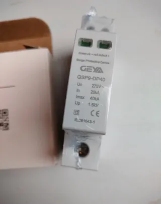 Protector de sobretensiones GEYA, modelo GSP9-DP40. - Tipo 2. - Tensión nominal: 275V~. - Corriente nominal (In): 20kA. - Corriente máxima (Imax): 40kA. - Nivel de protección (Up): 1.5kV. - Indicador de estado: Verde (OK) / Rojo (Defecto). - Cumple norma IEC61643-1.