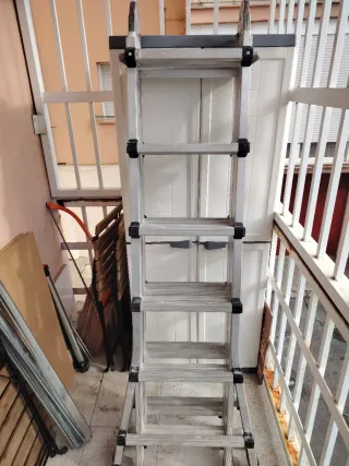 Escalera de aluminio con 6 peldaños y 4 tramos. - Material: Aluminio. - Número de peldaños: 6. - Número de tramos: 4 cada uno de ellos de 1,80. Tiene estabilizador en cada tramo final. Se puede abrir en tijera o extendida de 2 cuerpos a 3,60 o 4 cuerpos de 7,20