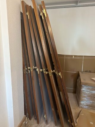 Conjunto de tres puertas antiguas de madera, con un diseño rústico y robusto. Precio negociable - Acabado en color marrón. - Detalles de remaches metálicos. - Ideal para proyectos de restauración o decoración.