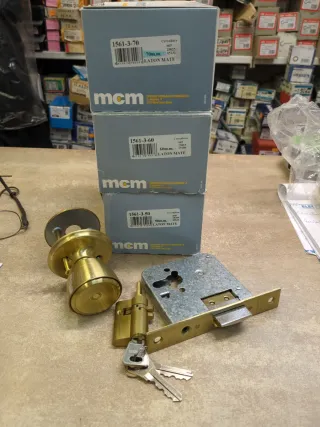 Set de cerraduras y pomos de la marca MCM. Incluye tres unidades de diferentes medidas. Habría varias unidades de cada medida - Cerradura de 70mm. - Cerradura de 60mm. - Cerradura de 50mm. - Pomo de latón.