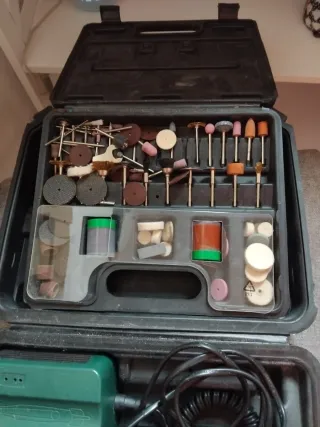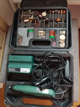 Rotaflexo marca Parkside en su maletín original con todos sus accesorios. - Maletín de transporte. - Herramienta rotatoria. - Cargador. - Amplia variedad de accesorios para lijar, pulir, cortar y grabar.