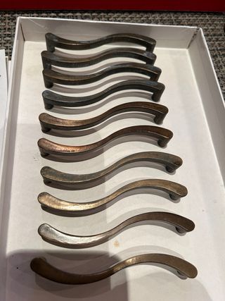 Tirador sinuoso metal dorado envejecido. 10,5 de largo x 1,5 alto. De tornillo a tornillo 10 cms. Tengo 10 unidades