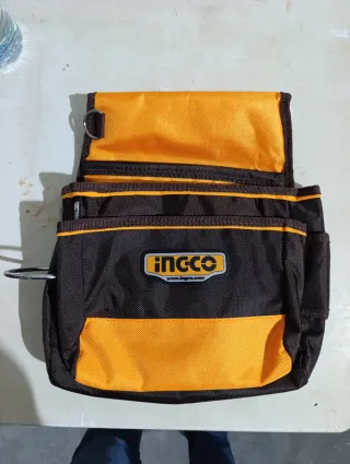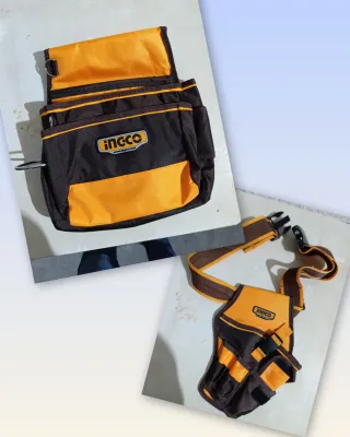 2 Prácticos bolsos portaherramientas de la marca INGCO, diseñado para organizar y transportar tus herramientas de forma eficiente. - Color negro y naranja. - Múltiples compartimentos y bolsillos. - Cierre superior con solapa.