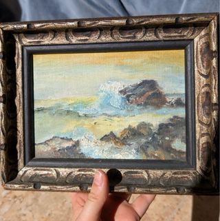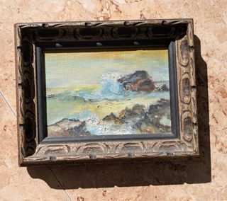 Pintura original al óleo que representa olas rompiéndose con fuerza contra formaciones rocosas, capturando el movimiento, la energía y la atmósfera del mar. La obra destaca por su riqueza cromática, profundidad y realismo, ideal para amantes del arte marino, paisajes costeros y decoración elegante. Se encuentra en perfecto estado de conservación. Incluye marco de madera antigua, que aporta carácter, autenticidad y un estilo clásico atemporal. Dimensiones aproximadas con marco: 20 x 25 cm.