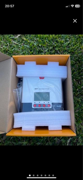 Regulador de carga solar MPPT de 40 amperios. Compatible con sistemas de 12V o 24V. - Tecnología MPPT para máxima eficiencia. - Pantalla LCD para visualización de datos. - Botones de control frontales. - Certificación CE RoHS. Nuevo a estrenar. Solo se sacó de la caja para hacer las fotos.