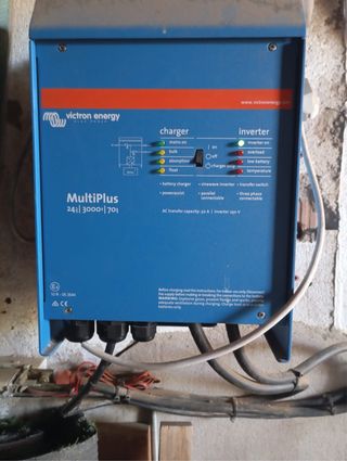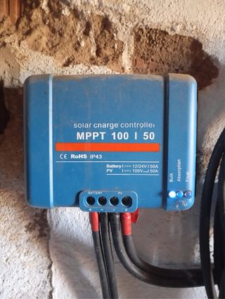 Se vende conjunto de 4 baterías y un inversor solar. - Baterías de color verde. - Inversor solar con pantalla digital y botones de control.