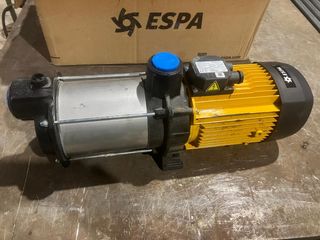 Bomba de agua plateada con detalles en negro y azul. - Cuerpo principal de metal plateado. - Salida roscada. - Conexión de entrada circular. - Base negra.