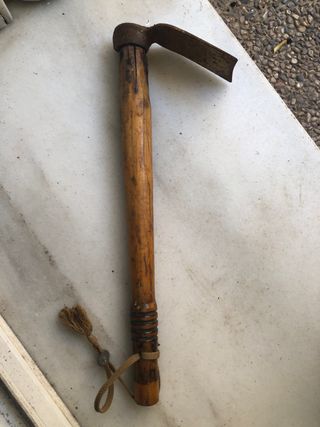 Herramienta agrícola antigua, un escardillo con mango de madera y cabeza de metal. La pala mide 7x 11cm - Mango de madera con detalles tallados. - Cabeza de metal con forma de azada. - Cuerda decorativa con borla en el extremo.