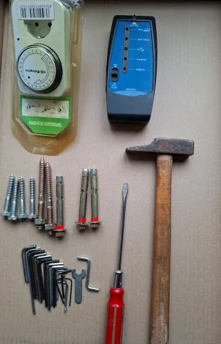 Leer bien, Conjunto de herramientas antiguas, un martillo y un destornillador. Regalo algunas llaves allen pequeñas, algunos tornillos y todo lo que se vé en las fotos, el temporizador esta sin usar y el detector no se si detecta bien o es que la pila estaba gastada, aunque al pulsar el botón sonaba, no incluye la pila. Recoger antes del fin de semana.