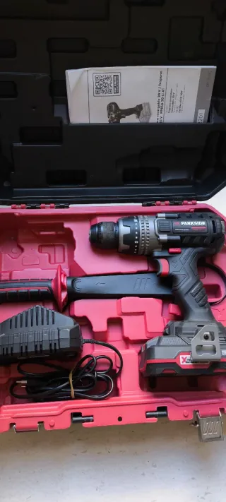 Taladro percutor inalámbrico Parkside de 120np, ideal para trabajos de bricolaje y construcción. Se entrega en su maletín original junto con el cargador. - Incluye taladro, maletín y cargador. - Mango auxiliar para mayor control. - Batería X20V TEAM.