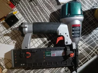 Pistola de puntas neumática de la marca EZ-Fasten. Ideal para trabajos de carpintería y bricolaje. - Cuerpo plateado y detalles en verde. - Empuñadura negra. - Gatillo naranja.