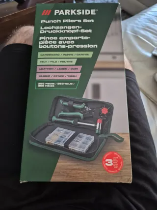 Set de sacabocados y remachadora de la marca Parkside. Incluye una funda para guardarlo todo. - Ideal para cartón, fieltro, cuero y tela. - 358 piezas incluidas. - Incluye sacabocados, remaches y martillo.