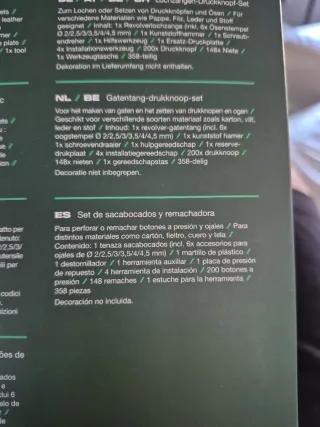 Conjunto de herramientas para trabajar cuero, ideal para la colocación de botones y remaches. - Incluye punzones de diferentes tamaños. - Base con orificios para remaches. - Dos piezas circulares metálicas.