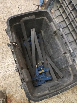 Conjunto de herramientas para taller carpintería Mordaza de banco roja. Mordaza de banco pequeña. Taladro angular neumático. Mango taladro Cuchillas y correa cepillo Discos de sierra. Soportes y guias de metal. Piezas metálicas variadas Guias caladora circular fresadora etc Material vario Lote entero 80 euros