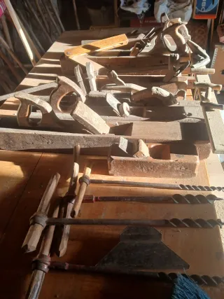 Conjunto de herramientas de carpintería antiguas, ideales para coleccionistas o aficionados a la restauración. - Incluye varias garlopas de madera y metal. - Variedad de barrenas y brocas antiguas. - Piezas de madera y metal con aspecto envejecido.