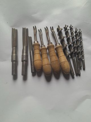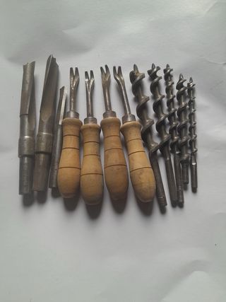 Conjunto de herramientas de carpintería y brocas para madera. - Brocas helicoidales de diferentes tamaños. - Escariadores o buriles con mangos de madera.