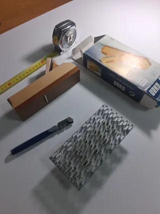 Conjunto de herramientas para carpintería. - Cepillo de madera marca URKO. Cuchilla de acero cromo-vanadio - Cinta métrica Stanley. 5m - Raspador para escayola RubiTools. - Cortador de vidrio